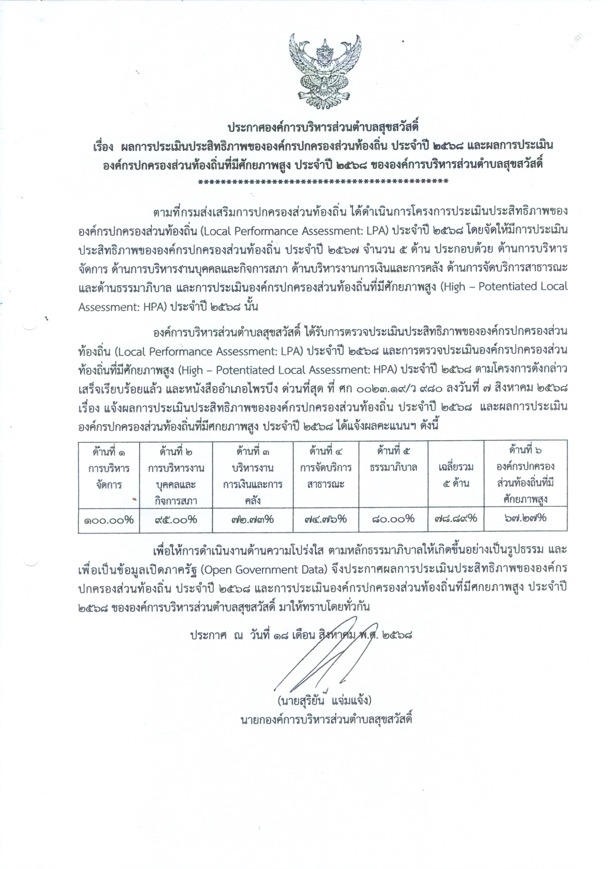 ประกาศผลการประเมินประสิทธิภาพขององค์กรปกครองส่วนท้องถิ่น ประจำปี 2568 และผลการประเมินประสิทธิภาพขององค์กรปกครองส่วนท้องถิ่นที่มีศักยภาพสูง ประจำปี 2568 ขององค์การบริหารส่วนตำบลสุขสวัสดิ์
